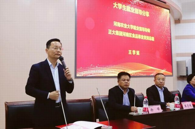 王學(xué)斌***總裁講述了自己的奮斗歷程,并結(jié)合自身經(jīng)歷和正大集團事業(yè)規(guī)劃,為在場畢業(yè)生做就業(yè)指導(dǎo)報告。為大家的就業(yè)選擇提供指導(dǎo),提醒同學(xué)們選擇自己適合的工作。